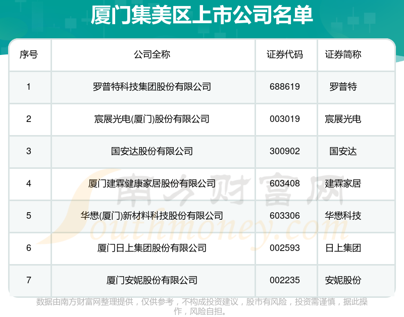 數(shù)量上來看,截至12月18日,廈門集美區(qū)共有7家A股上市公司。其中,在上海證券交易所上市的有華懋科技、建霖家居、羅普特等3家,在深圳證券交易所上市的有4家:安妮股份、日上集團、宸展光電、國安達等。