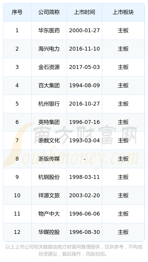 從市值來(lái)看,杭州拱墅區(qū)主板上市公司市值排名依次為:杭州銀行(1130.84億)、華東醫(yī)藥(707.05億)、物產(chǎn)中大(282.35億)、杭鋼股份(263.76億)、浙版?zhèn)髅?173.78億)、海興電力(161.93億)、浙數(shù)文化(157.75億)、金石資源(150.49億)、英特集團(tuán)(68.79億)、百大集團(tuán)(65.47億)。