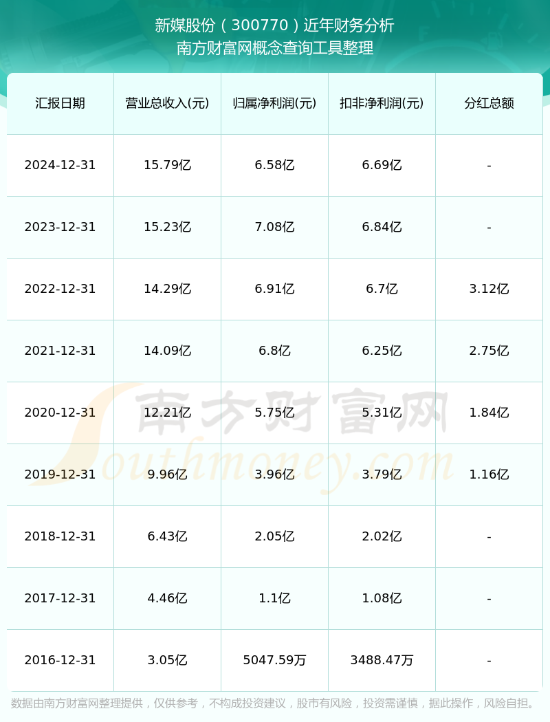 新媒股份公司2024年實(shí)現(xiàn)營(yíng)業(yè)收入15.79億元,同比增長(zhǎng)3.63%;凈利潤(rùn)6.58億元,同比增長(zhǎng)-7.04%;毛利率50.2%。
