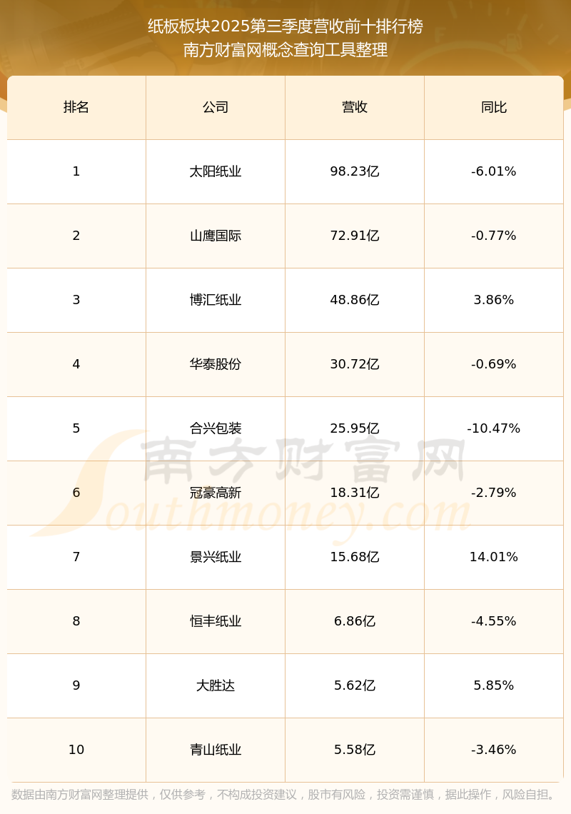按照南方財(cái)富網(wǎng)概念查詢工具統(tǒng)計(jì),該股所屬板塊為紙板板塊,該板塊共有18只股票,大勝達(dá)2025第三季度營(yíng)收在該板塊中排名為第9名,該板塊2025第三季度營(yíng)收排名前十的股票如下表: