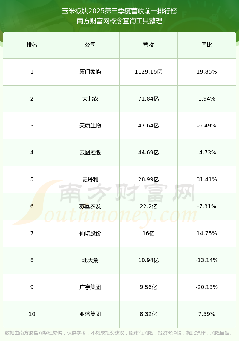 按照南方財富網(wǎng)概念查詢工具統(tǒng)計,該股所屬板塊為玉米板塊,該板塊共有20只股票,萬向德農(nóng)2025第三季度營收在該板塊中排名為第20名,該板塊2025第三季度營收排名前十的股票如下表: