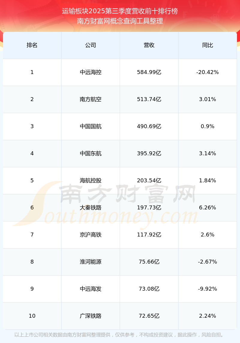 按照南方財(cái)富網(wǎng)概念查詢工具統(tǒng)計(jì),該股所屬板塊為運(yùn)輸板塊,該板塊共有37只股票,遼港股份2025第三季度營收在該板塊中排名為第37名,該板塊2025第三季度營收排名前十的股票如下表:
