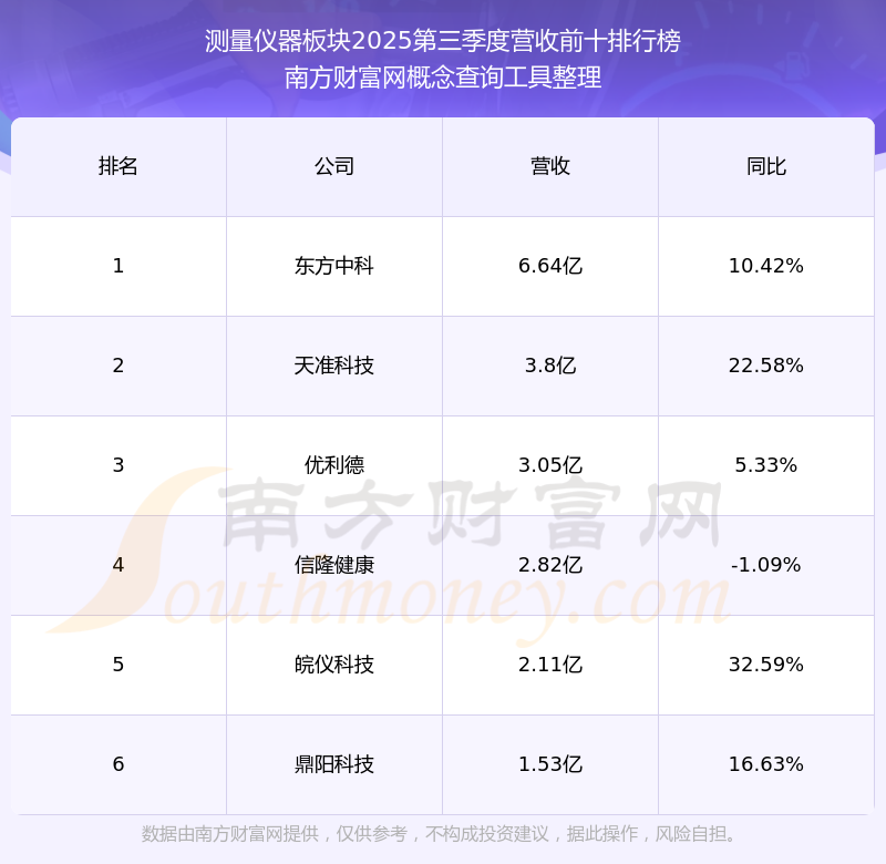按照南方財(cái)富網(wǎng)概念查詢(xún)工具統(tǒng)計(jì),該股所屬板塊為測(cè)量?jī)x器板塊,該板塊共有6只股票,優(yōu)利德2025第三季度營(yíng)收在該板塊中排名為第3名,該板塊2025第三季度營(yíng)收排名前十的股票如下表: