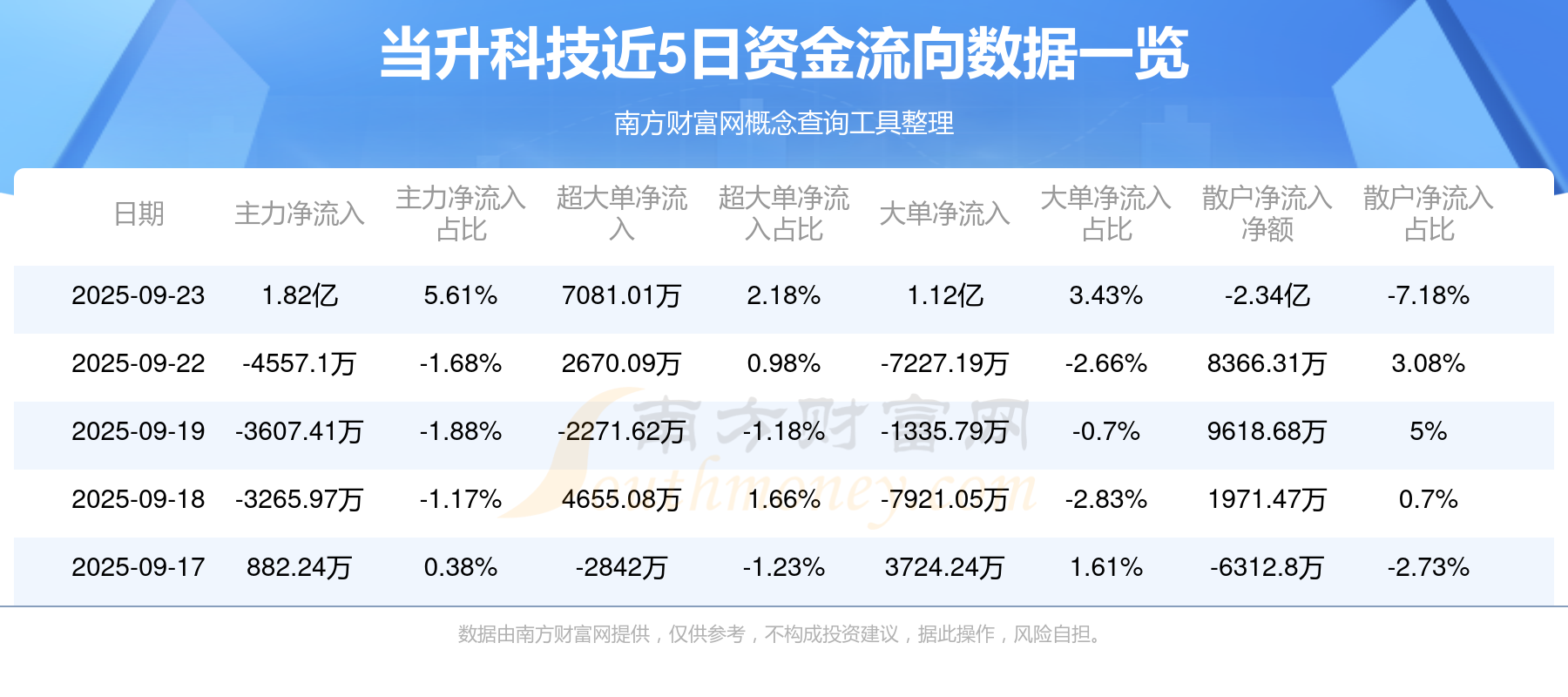 9月23日消息,當(dāng)升科技9月23日主力資金凈流入1.82億元,超大單資金凈流入7081.01萬(wàn)元,大單資金凈流入1.12億元,散戶資金凈流出2.34億元。