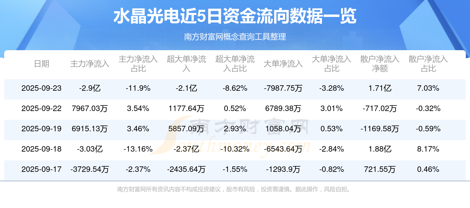9月23日消息,水晶光電9月23日主力凈流出2.9億元,超大單凈流出2.1億元,大單凈流出7987.75萬(wàn)元,散戶(hù)凈流入1.71億元。