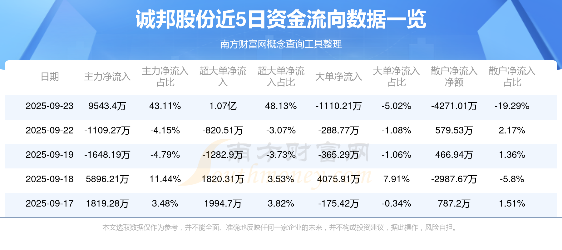 9月23日消息,誠邦股份9月23日主力凈流入9543.4萬元,超大單凈流入1.07億元,大單凈流出1110.21萬元,散戶凈流出4271.01萬元。