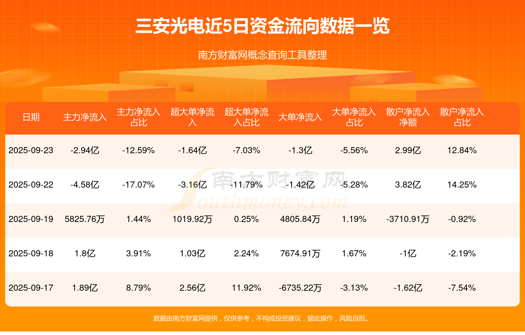 9月23日消息,三安光電9月23日主力凈流出2.94億元,超大單凈流出1.64億元,大單凈流出1.3億元,散戶凈流入2.99億元。