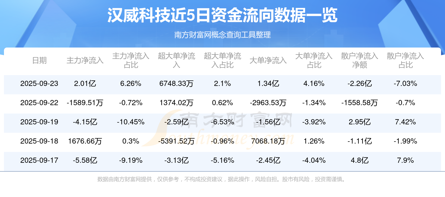 9月23日消息,漢威科技主力資金凈流入2.01億元,超大單資金凈流入6748.33萬元,散戶資金凈流出2.26億元。