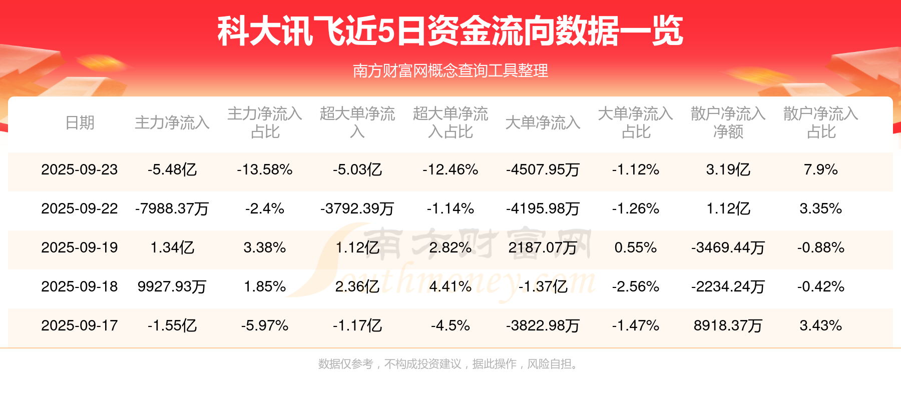9月23日消息,科大訊飛資金凈流出5.48億元,超大單資金凈流出5.03億元,換手率3.56%,成交金額40.35億元。