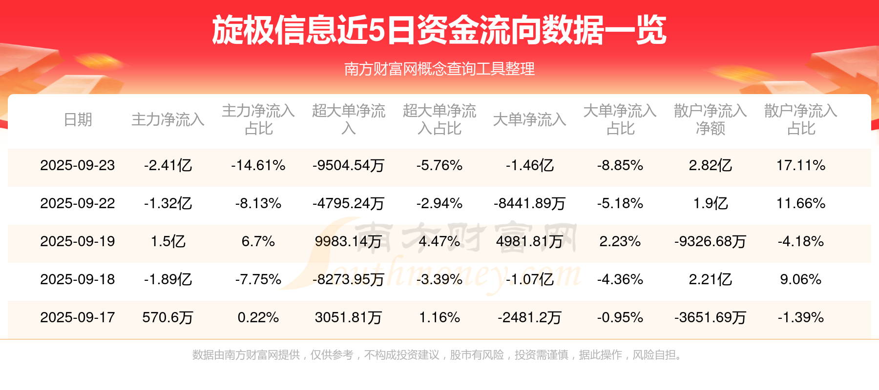 9月23日消息,旋極信息主力凈流出2.41億元,超大單凈流出9504.54萬元,散戶凈流入2.82億元。