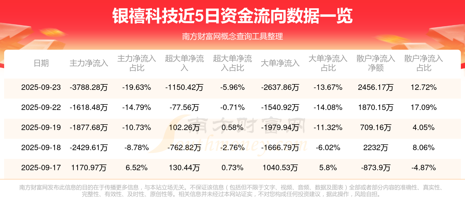 9月23日消息,銀禧科技資金凈流出3788.28萬(wàn)元,超大單資金凈流出1150.42萬(wàn)元,換手率5.03%,成交金額1.93億元。