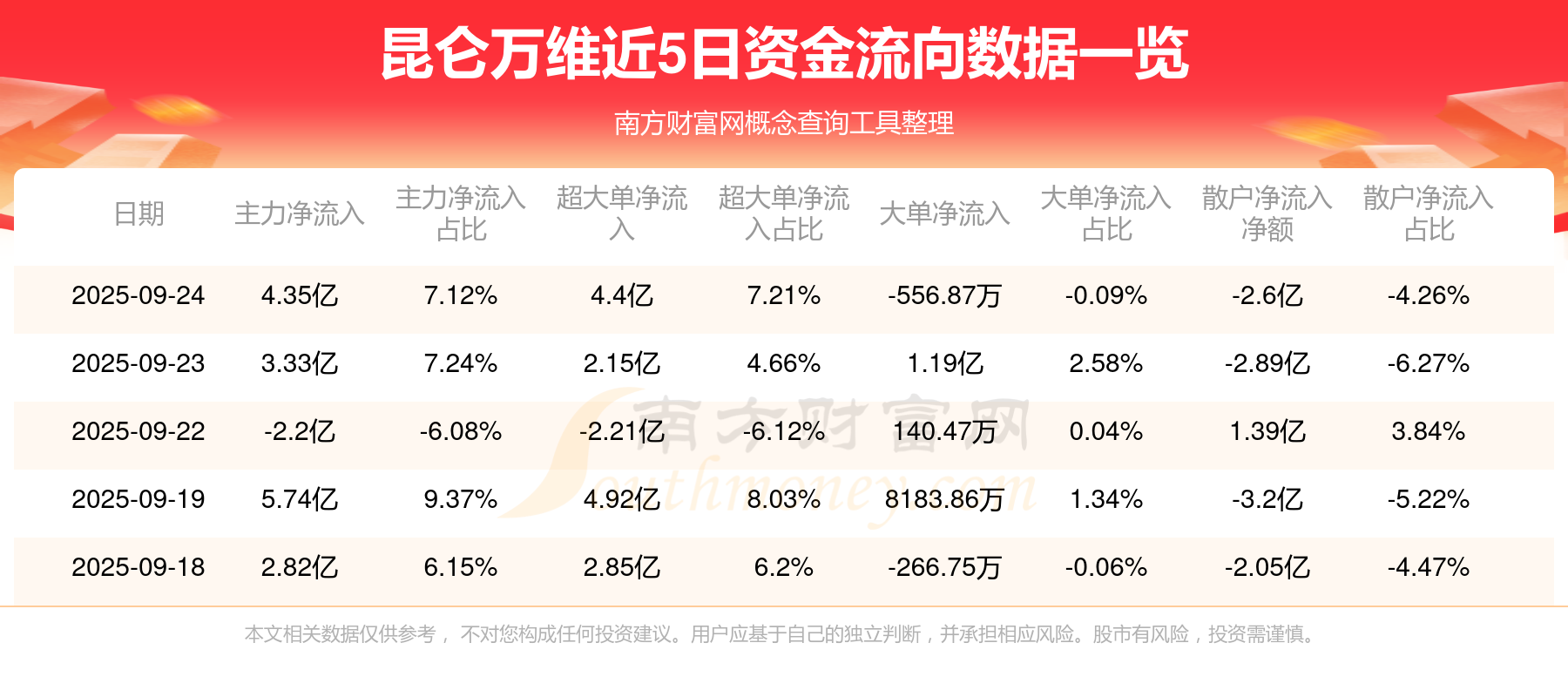 9月24日消息,昆侖萬維主力資金凈流入4.35億元,超大單資金凈流入4.4億元,散戶資金凈流出2.6億元。