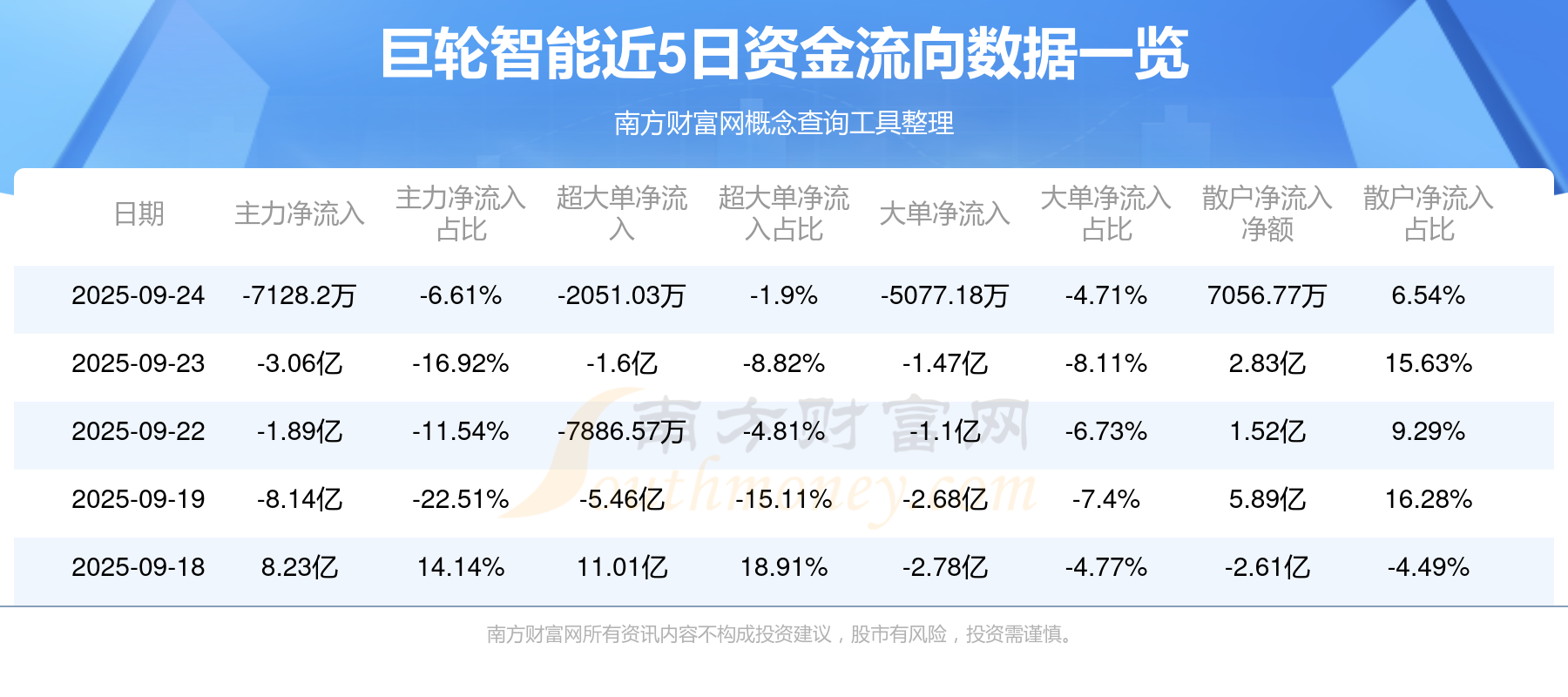9月24日消息,巨輪智能7日內股價下跌7.32%,截至下午三點收盤,該股報8.470元,漲0.71%,總市值為186.29億元。