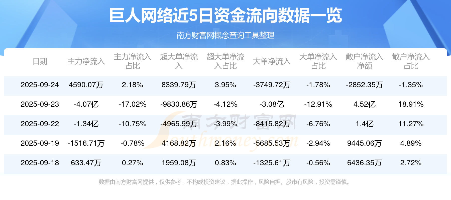 9月24日消息,巨人網(wǎng)絡(luò)9月24日主力凈流入4590.07萬元,超大單凈流入8339.79萬元,大單凈流出3749.72萬元,散戶凈流出2852.35萬元。