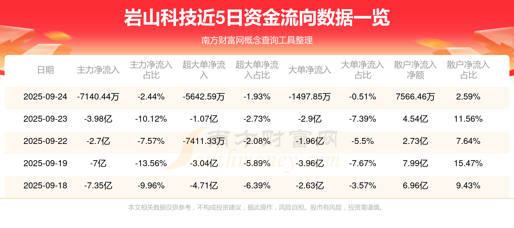 9月24日消息,巖山科技資金凈流出7140.44萬元,超大單資金凈流出5642.59萬元,換手率6.82%,成交金額29.23億元。