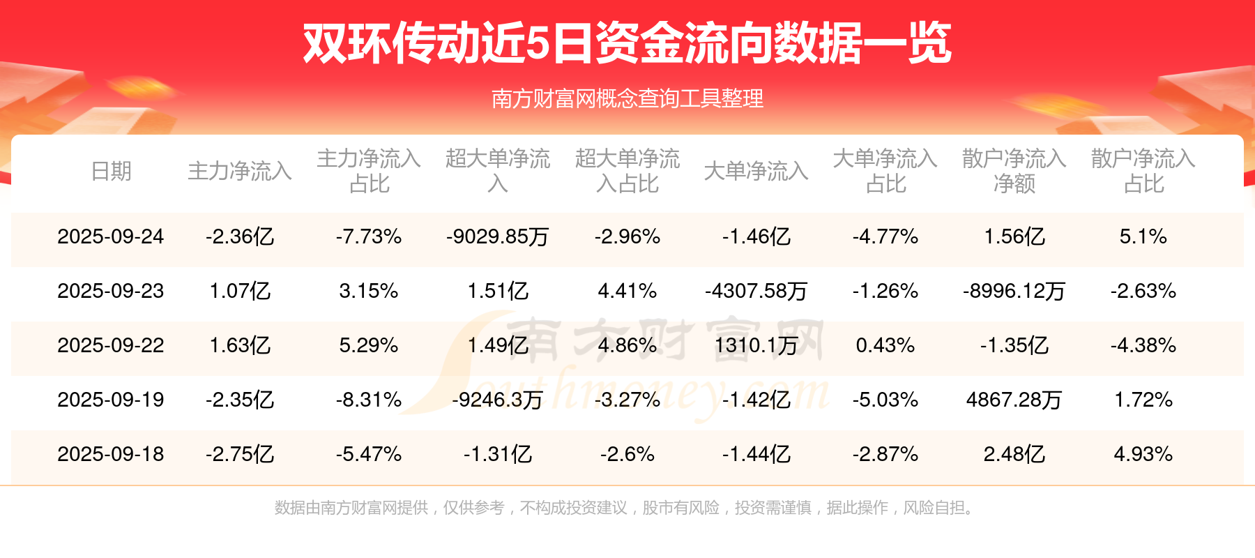 9月24日消息,雙環(huán)傳動9月24日主力凈流出2.36億元,超大單凈流出9029.85萬元,大單凈流出1.46億元,散戶凈流入1.56億元。