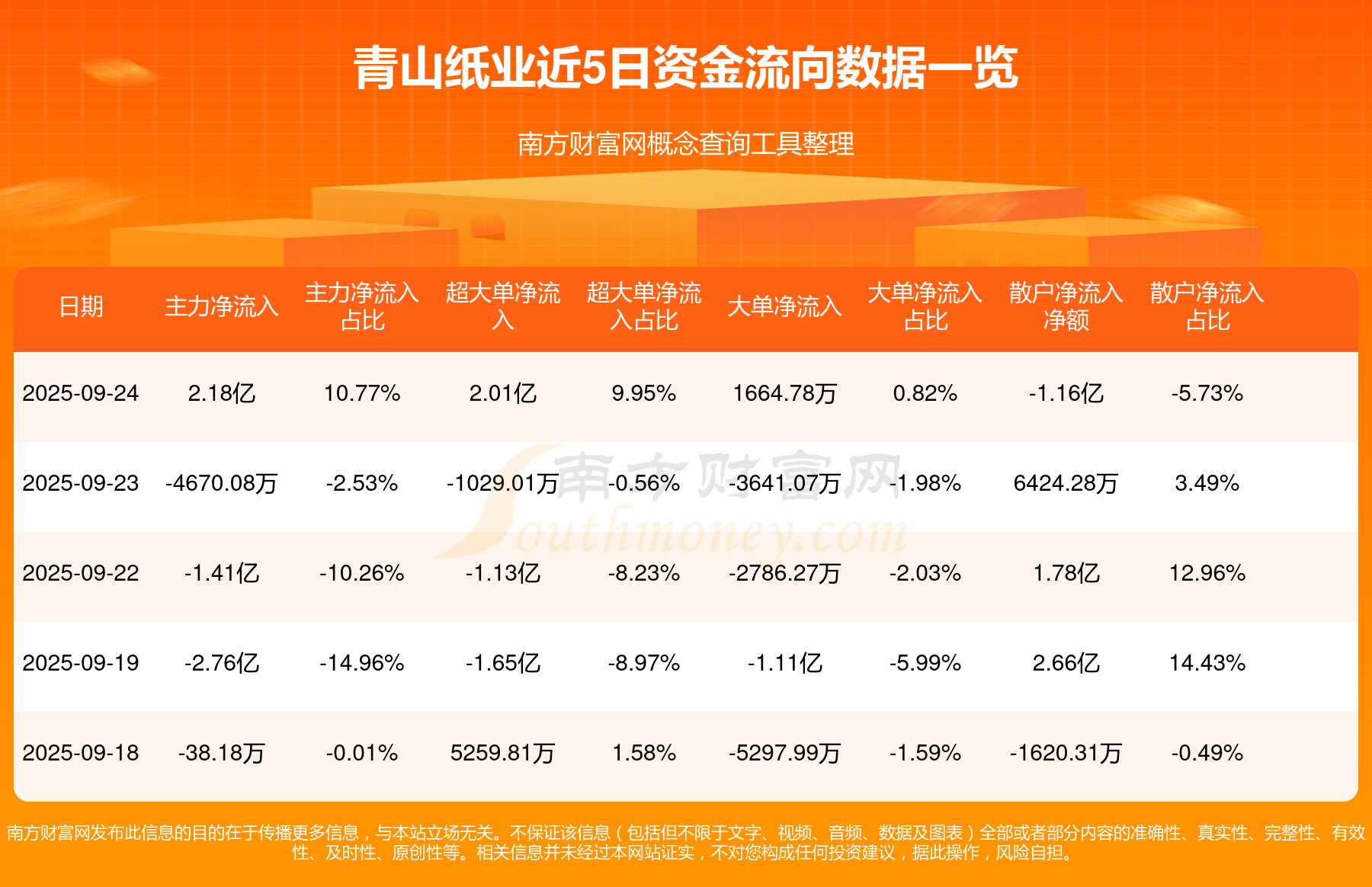 9月24日消息,青山紙業(yè)9月24日主力資金凈流入2.18億元,超大單資金凈流入2.01億元,大單資金凈流入1664.78萬元,散戶資金凈流出1.16億元。