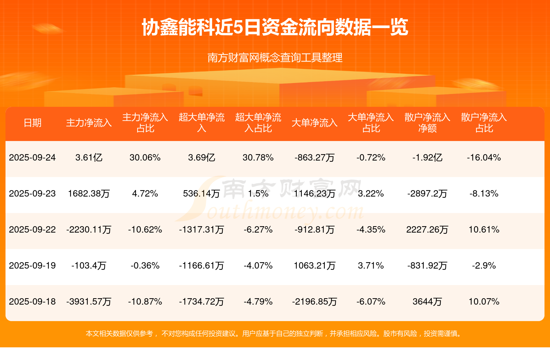 9月24日消息,協(xié)鑫能科9月24日主力資金凈流入3.61億元,超大單資金凈流入3.69億元,大單資金凈流出863.27萬元,散戶資金凈流出1.92億元。