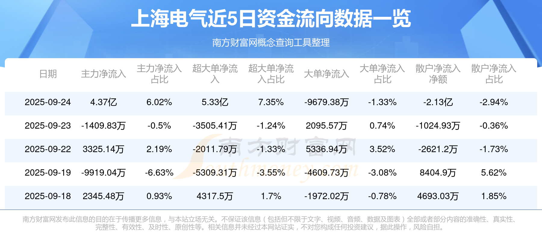 9月24日消息,上海電氣9月24日主力資金凈流入4.37億元,超大單資金凈流入5.33億元,大單資金凈流出9679.38萬元,散戶資金凈流出2.13億元。