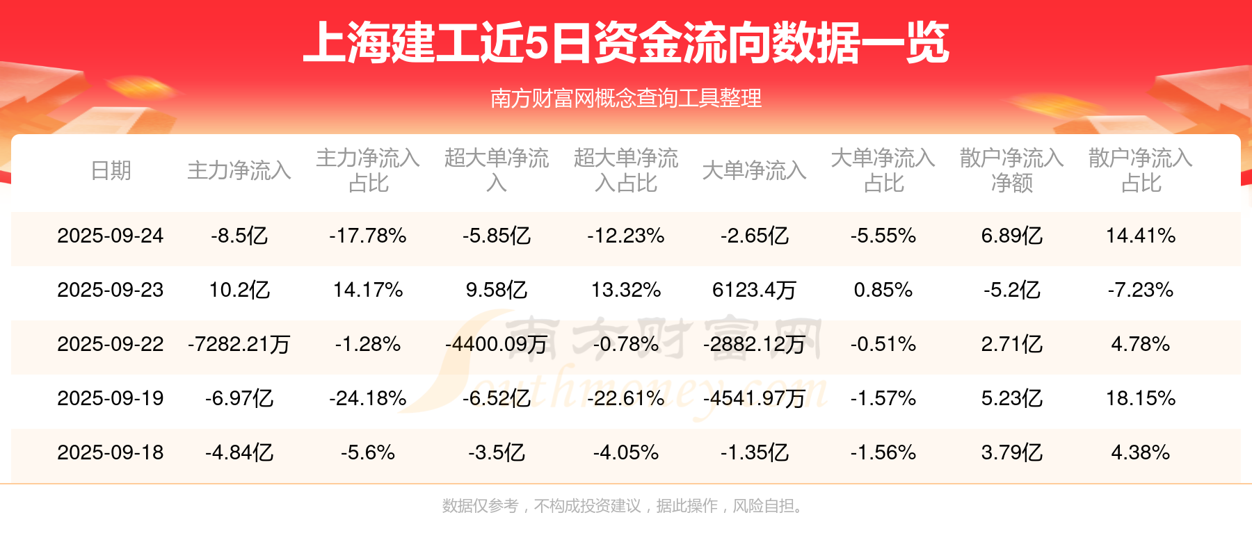 9月24日消息,上海建工主力資金凈流出8.5億元,超大單資金凈流出5.85億元,散戶資金凈流入6.89億元。