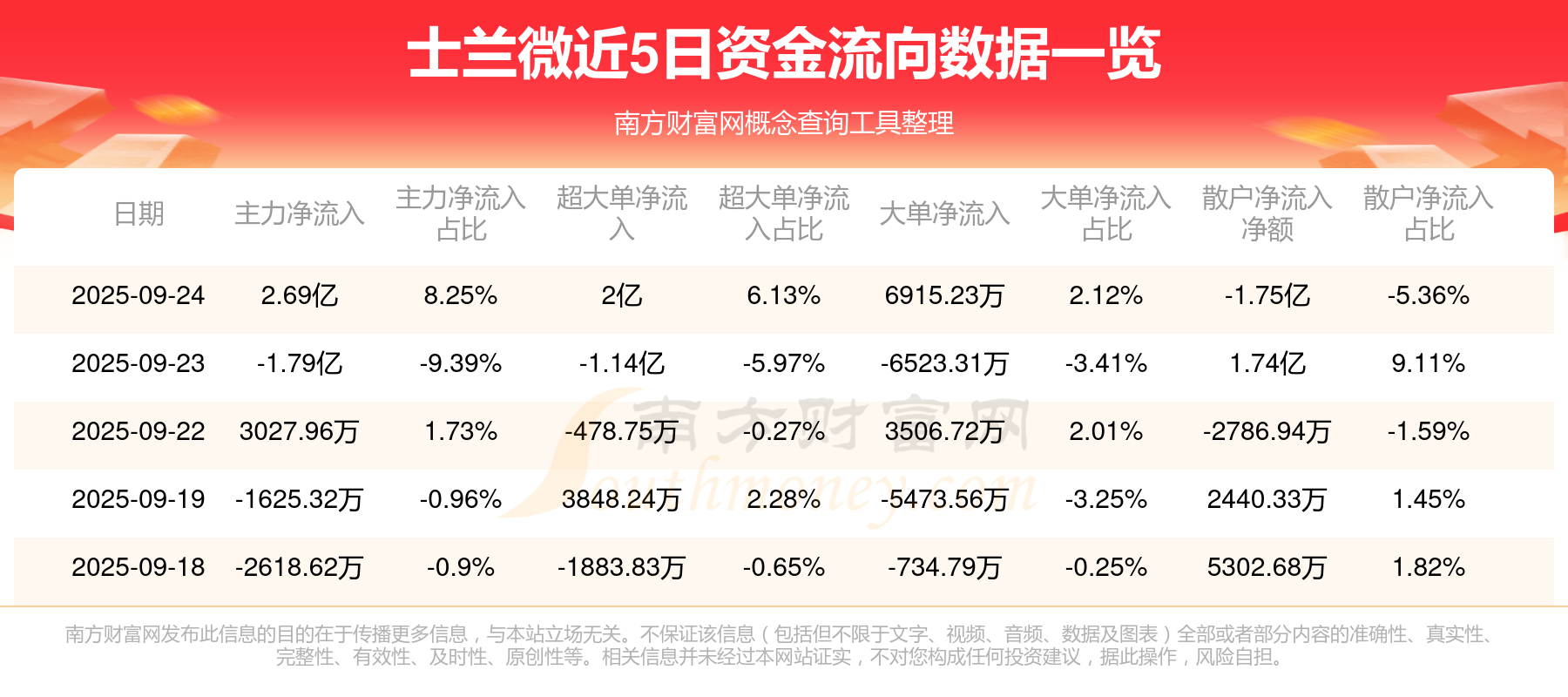 9月24日該股主力凈流入2.69億元,超大單凈流入2億元,大單凈流入6915.23萬元,中單凈流出9403.3萬元,散戶凈流出1.75億元。