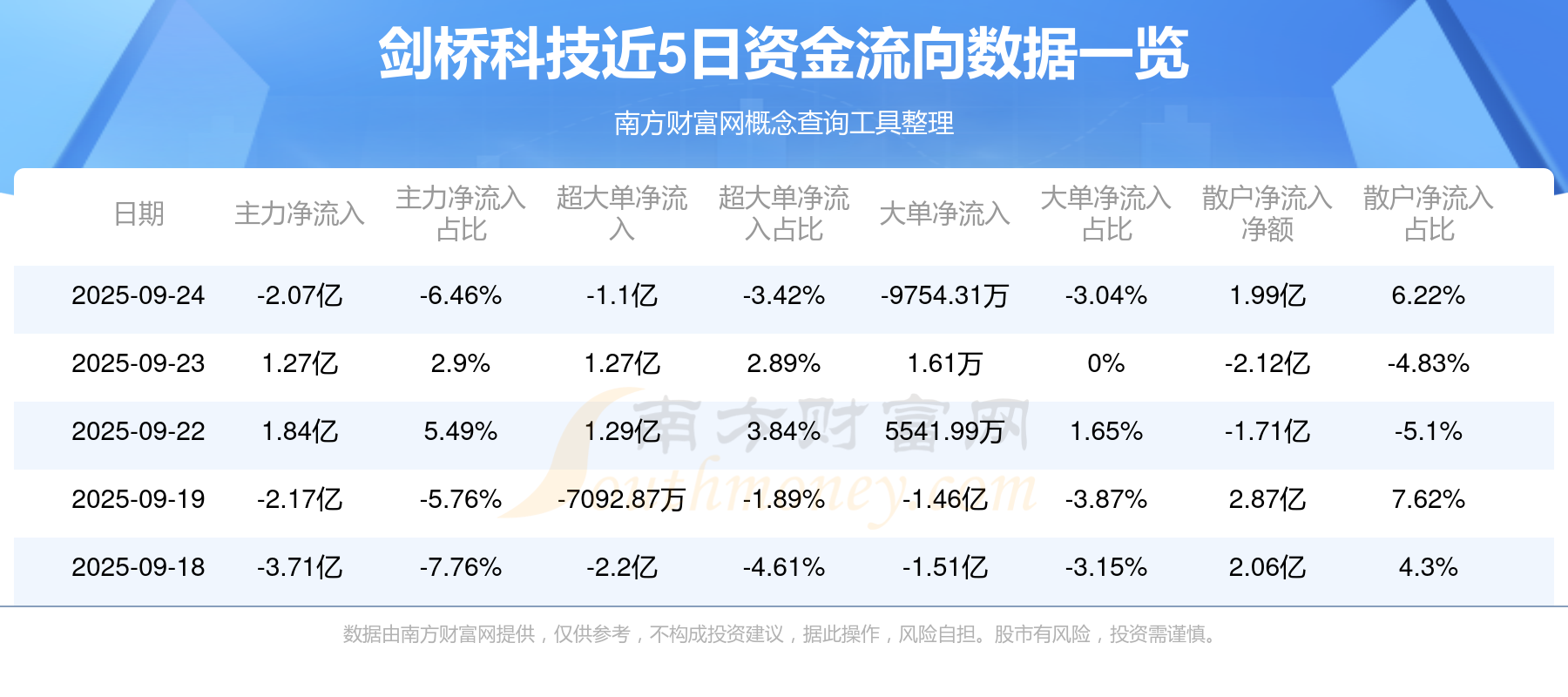9月24日消息,劍橋科技資金凈流出2.07億元,超大單資金凈流出1.1億元,換手率10.76%,成交金額32.07億元。