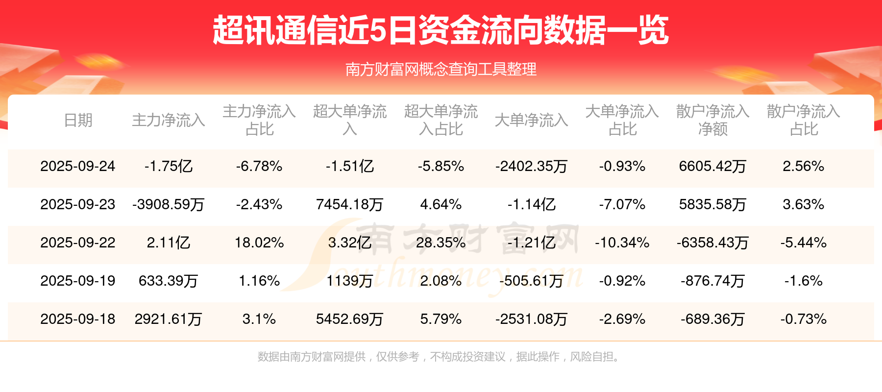 9月24日消息,超訊通信主力凈流出1.75億元,超大單凈流出1.51億元,散戶凈流入6605.42萬(wàn)元。
