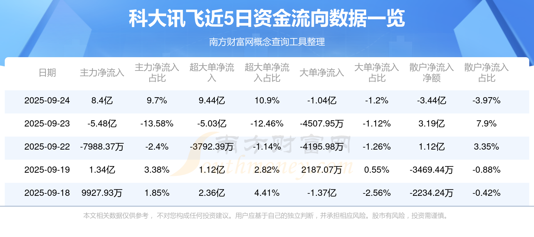 9月24日消息,科大訊飛主力資金凈流入8.4億元,超大單資金凈流入9.44億元,散戶資金凈流出3.44億元。