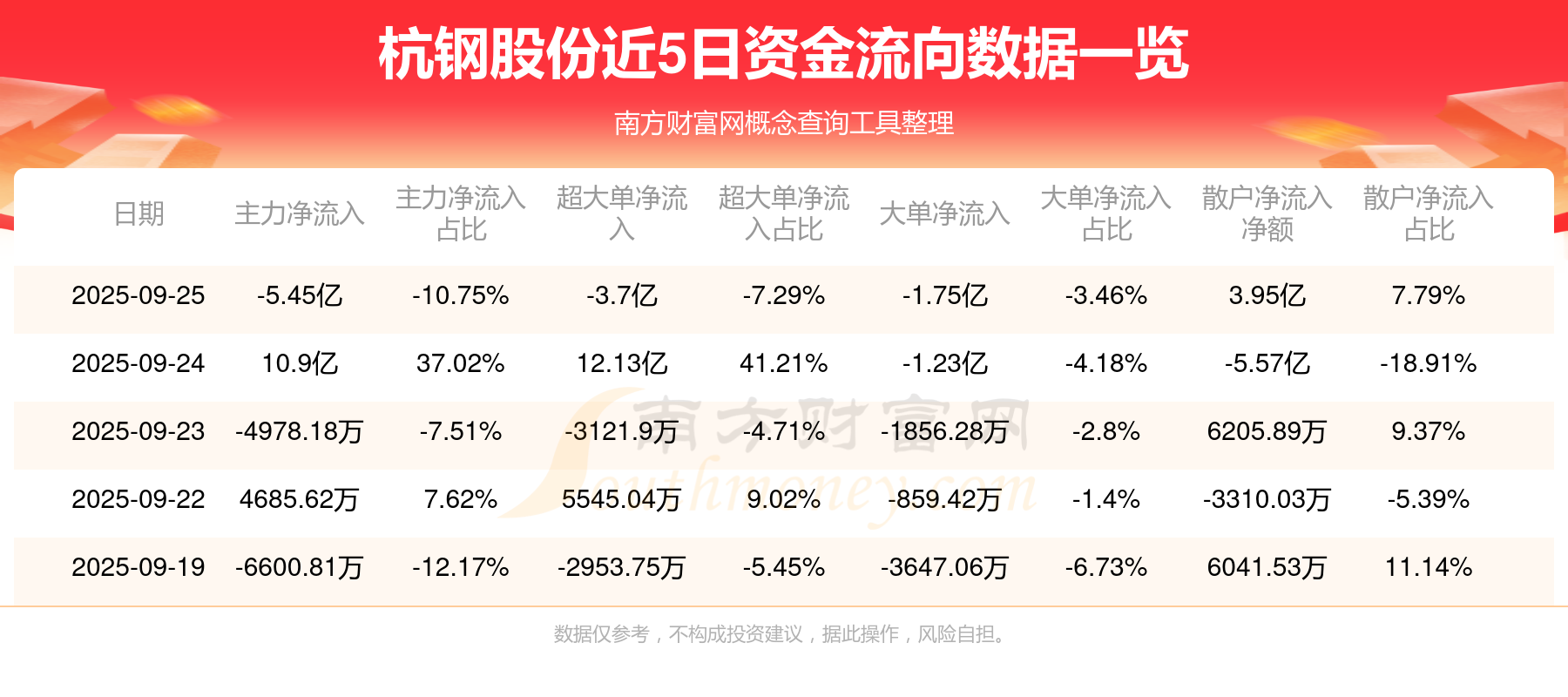 9月25日消息,杭鋼股份資金凈流出-5.45億元,超大單資金凈流入-3.7億元,最新報(bào)10.690元,換手率14.04%,成交總金額50.72億元。