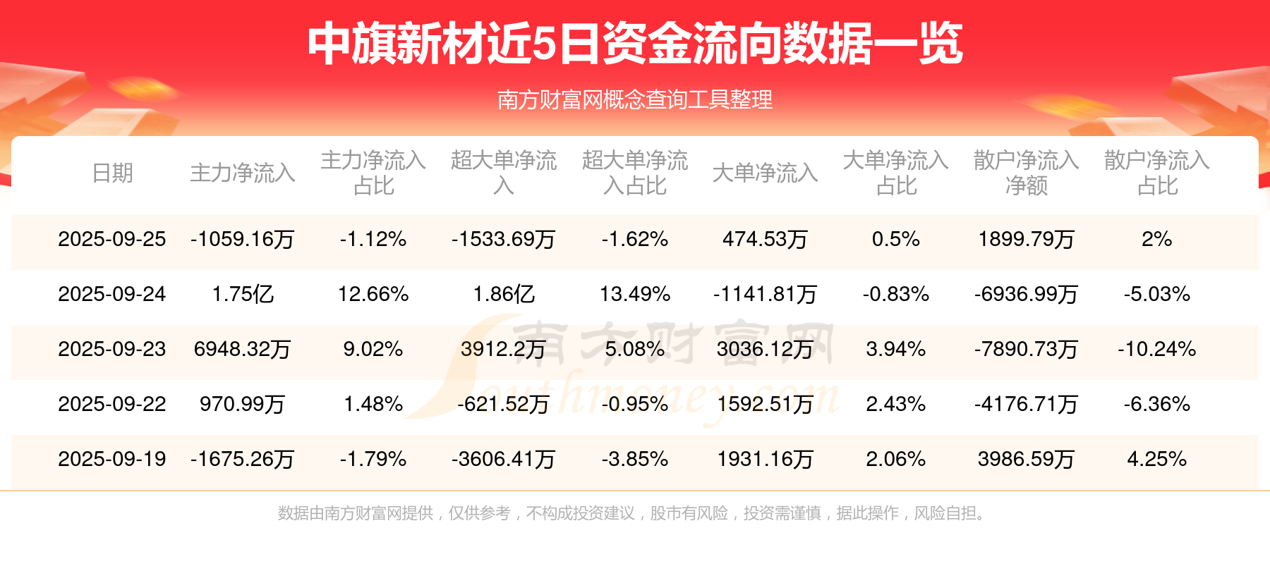 9月25日消息,中旗新材9月25日主力資金凈流出1059.16萬元,超大單資金凈流出1533.69萬元,大單資金凈流入474.53萬元,散戶資金凈流入1899.79萬元。