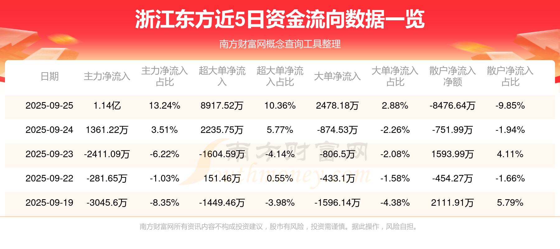9月25日消息,浙江東方9月25日主力凈流入1.14億元,超大單凈流入8917.52萬(wàn)元,大單凈流入2478.18萬(wàn)元,散戶凈流出8476.64萬(wàn)元。