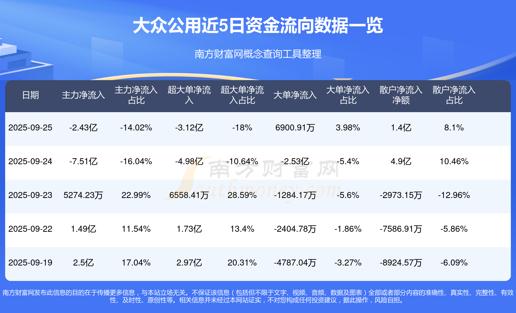 9月25日消息,大眾公用9月25日主力凈流出2.43億元,超大單凈流出3.12億元,大單凈流入6900.91萬元,散戶凈流入1.4億元。
