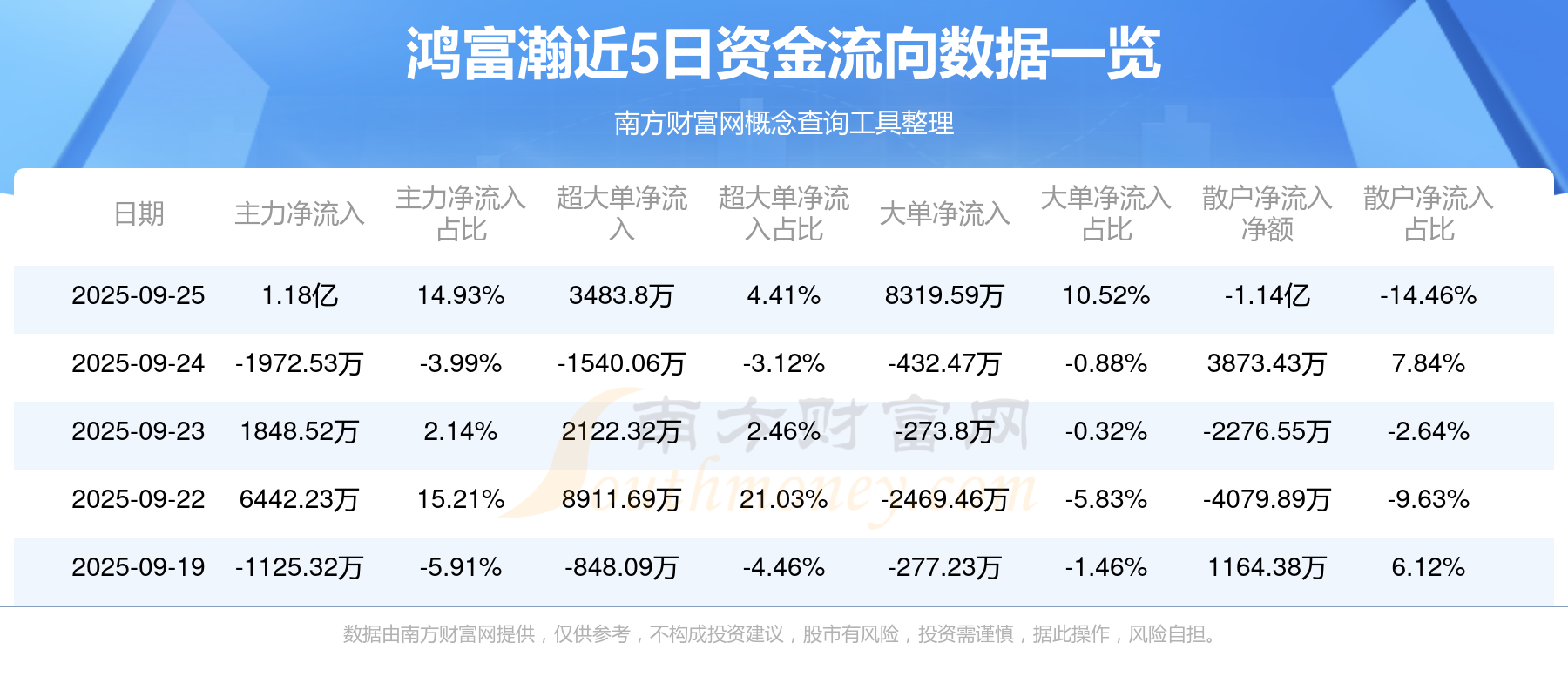 9月25日消息,鴻富瀚9月25日主力凈流入1.18億元,超大單凈流入3483.8萬元,大單凈流入8319.59萬元,散戶凈流出1.14億元。