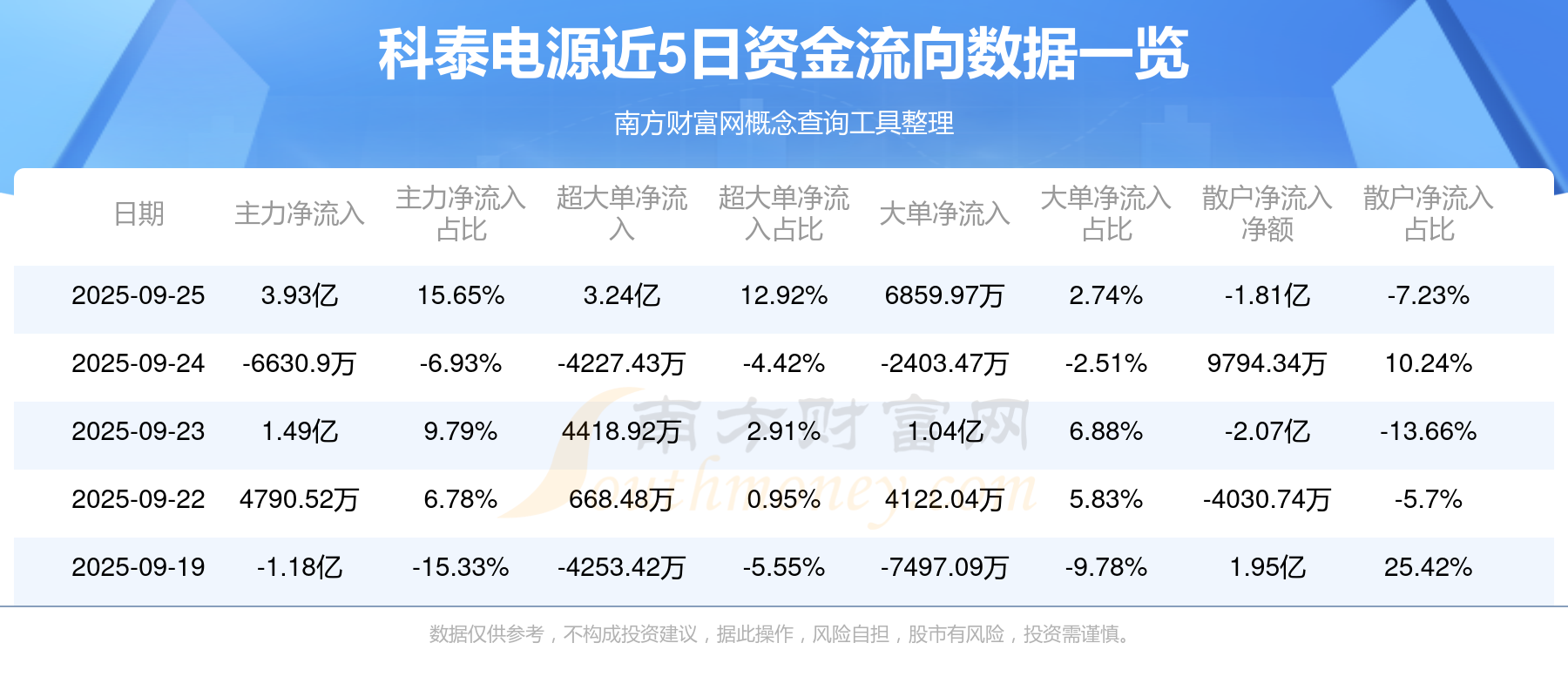 9月25日消息,科泰電源資金凈流入3.93億元,超大單資金凈流入3.24億元,換手率19.34%,成交金額25.08億元。