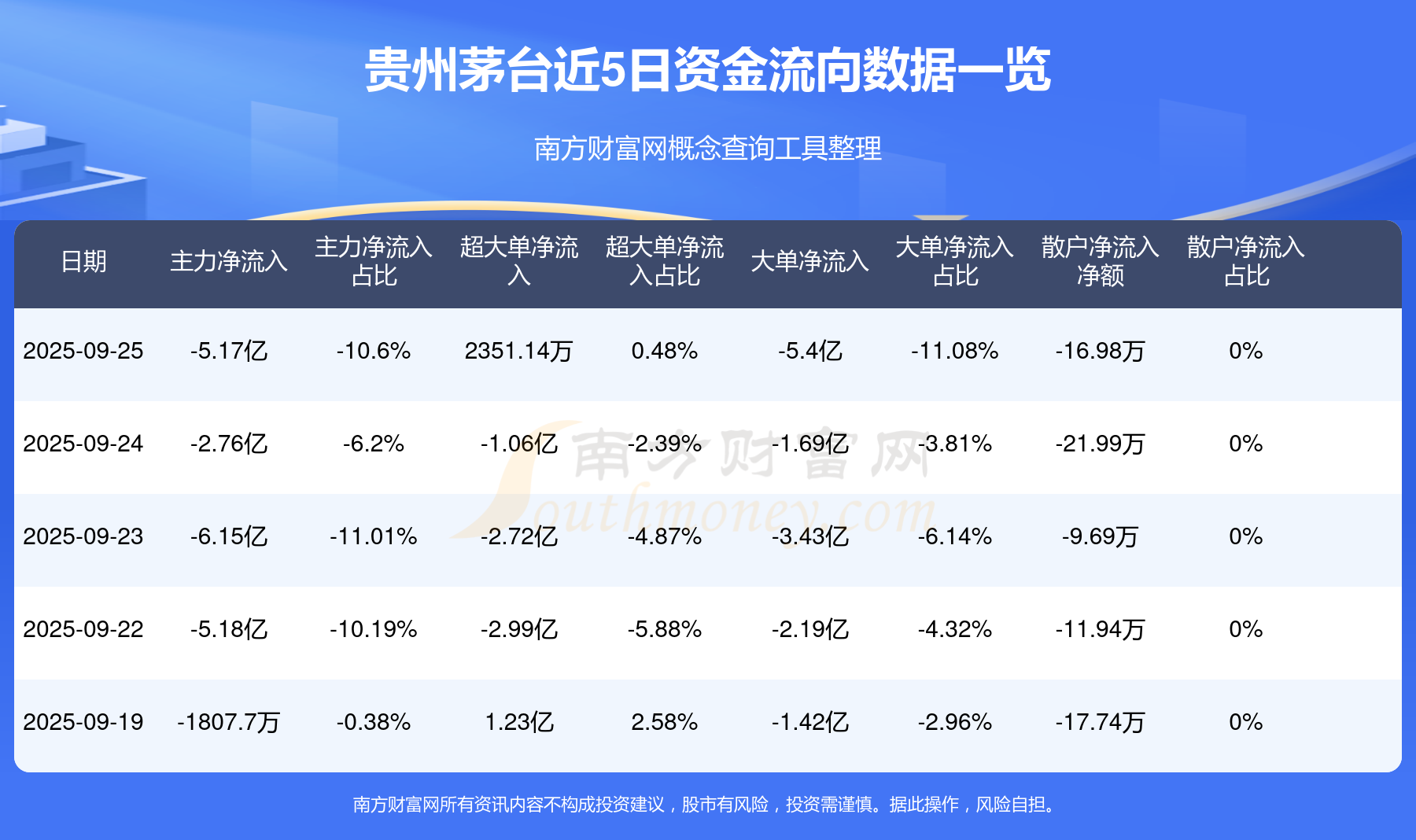 9月25日消息,貴州茅臺主力資金凈流出5.17億元,超大單資金凈流入2351.14萬元,散戶資金凈流出16.98萬元。