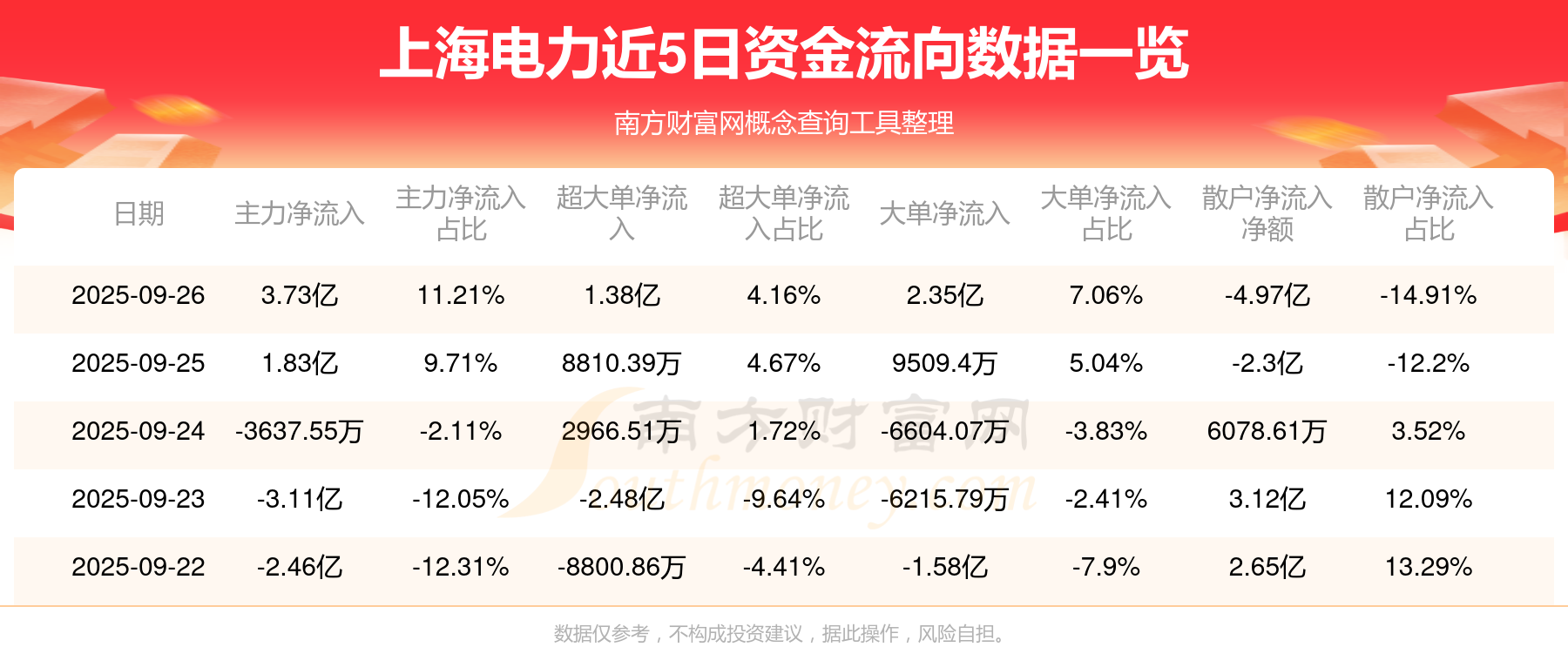 9月26日消息,上海電力資金凈流入3.73億元,超大單凈流入1.38億元,換手率5.92%,成交金額33億元。