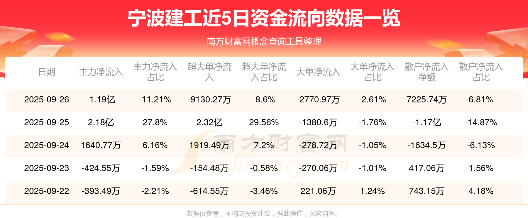 9月26日消息,寧波建工主力資金凈流出1.19億元,超大單資金凈流出9130.27萬(wàn)元,散戶(hù)資金凈流入7225.74萬(wàn)元。