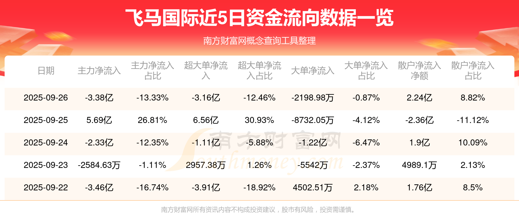 9月26日消息,飛馬國際主力凈流出3.38億元,超大單凈流出3.16億元,散戶凈流入2.24億元。