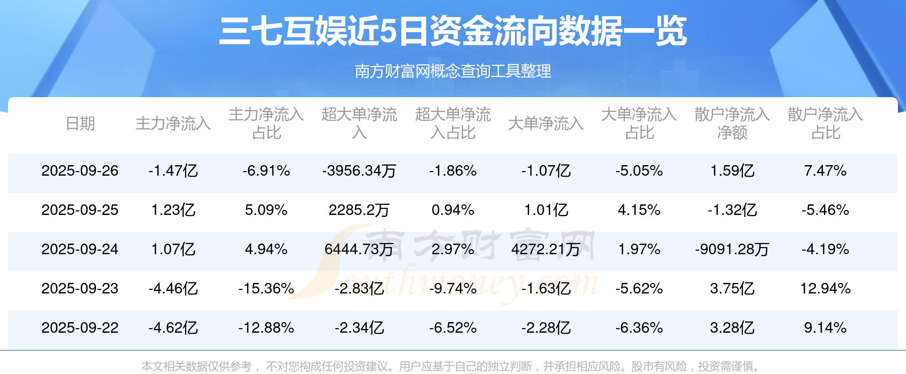 9月26日消息,三七互娛主力資金凈流出1.47億元,超大單資金凈流出3956.34萬元,散戶資金凈流入1.59億元。