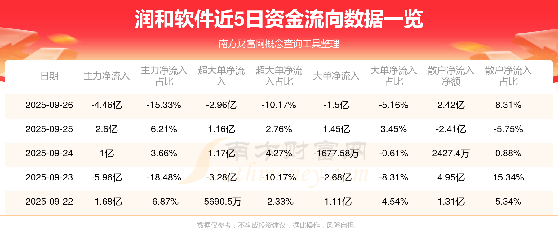 9月26日消息,潤和軟件資金凈流出4.46億元,超大單凈流出2.96億元,換手率6.25%,成交金額29.09億元。