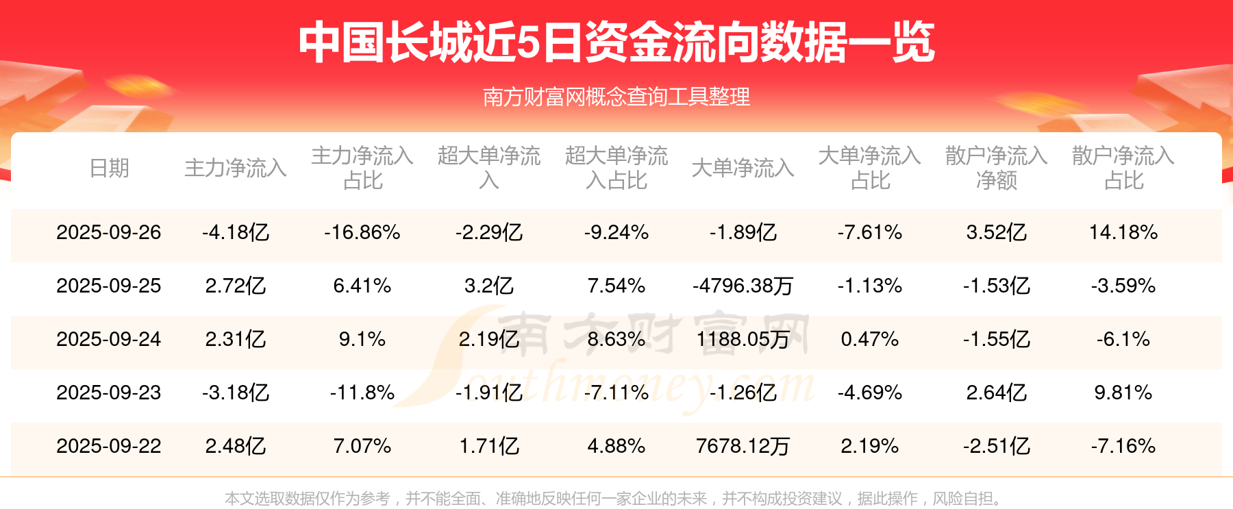 9月26日消息,中國長城主力凈流出4.18億元,超大單凈流出2.29億元,散戶凈流入3.52億元。