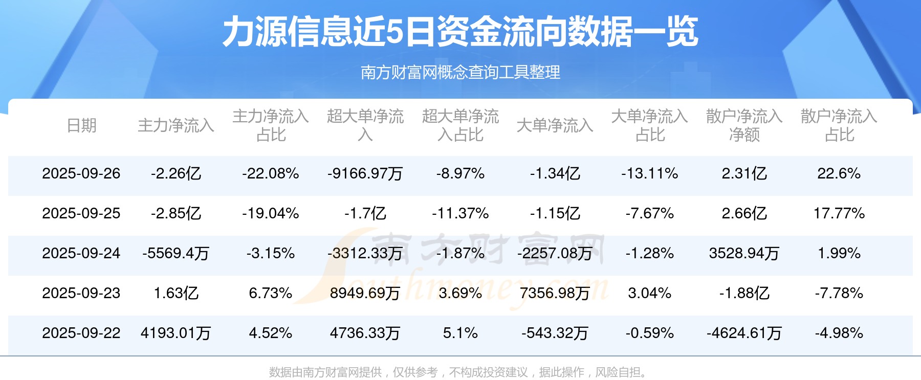 9月26日消息,力源信息主力資金凈流出2.26億元,超大單資金凈流出9166.97萬元,散戶資金凈流入2.31億元。