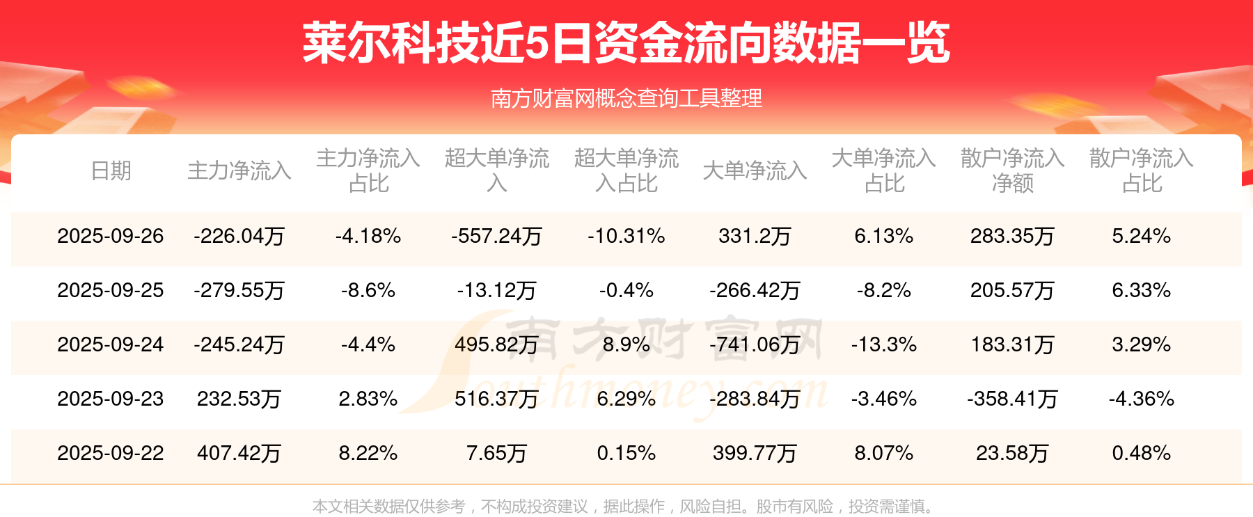 9月26日消息,萊爾科技資金凈流出226.04萬元,超大單資金凈流出557.24萬元,換手率1.01%,成交金額5403.38萬元。