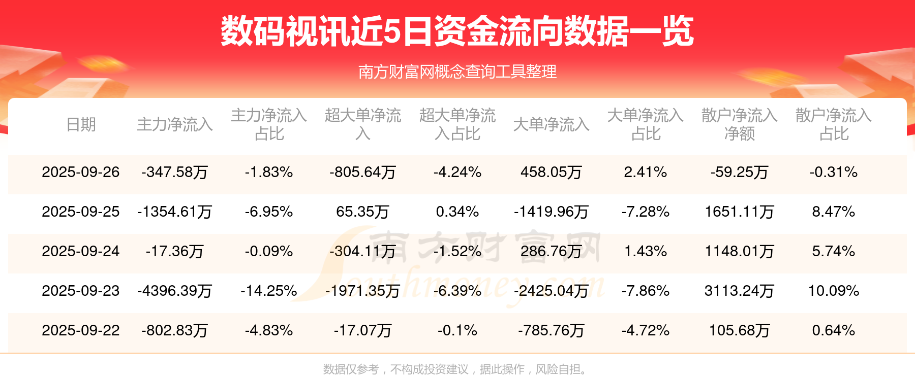 9月26日消息,數(shù)碼視訊9月26日主力凈流出347.58萬元,超大單凈流出805.64萬元,大單凈流入458.05萬元,散戶凈流出59.25萬元。