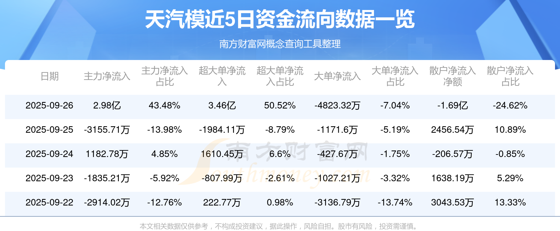 9月26日消息,天汽模主力資金凈流入2.98億元,超大單資金凈流入3.46億元,散戶資金凈流出1.69億元。