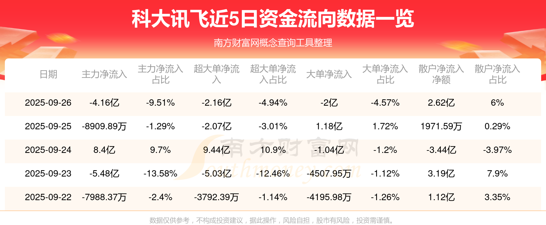 9月26日消息,科大訊飛資金凈流出4.16億元,超大單資金凈流出2.16億元,換手率3.64%,成交金額43.69億元。
