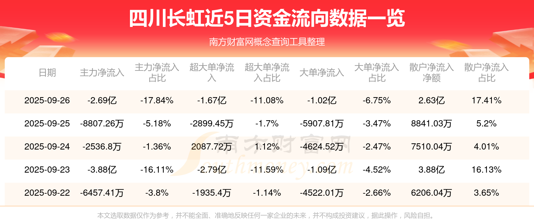 9月26日消息,四川長(zhǎng)虹9月26日主力資金凈流出2.69億元,超大單資金凈流出1.67億元,大單資金凈流出1.02億元,散戶資金凈流入2.63億元。
