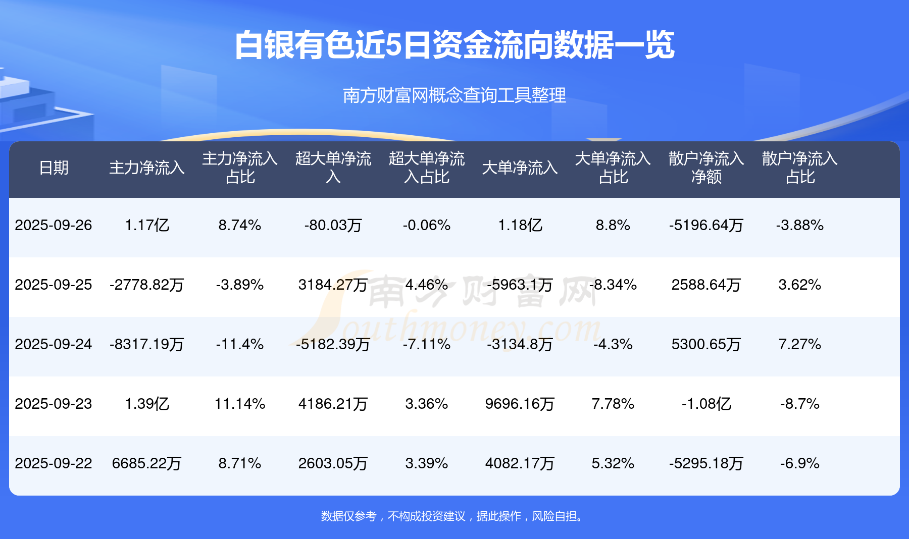 9月26日消息,白銀有色主力資金凈流入1.17億元,超大單資金凈流出80.03萬元,散戶資金凈流出5196.64萬元。