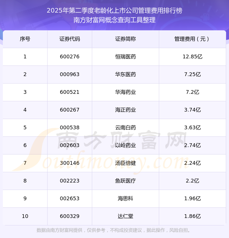 2025年第二季度,老齡化上市公司管理費用排名如下:恒瑞醫(yī)藥(600276)的管理費用總額高達12.85億,華東醫(yī)藥(000963)和華海藥業(yè)(600521)位居第二和第三,海正藥業(yè)(600267)、云南白藥(000538)、以嶺藥業(yè)(002603)、湯臣倍。300146)、魚躍醫(yī)療(002223)、海思科(002653)、達仁堂(600329)分別進入前十,其管理費用總額分別排名第4-10名。