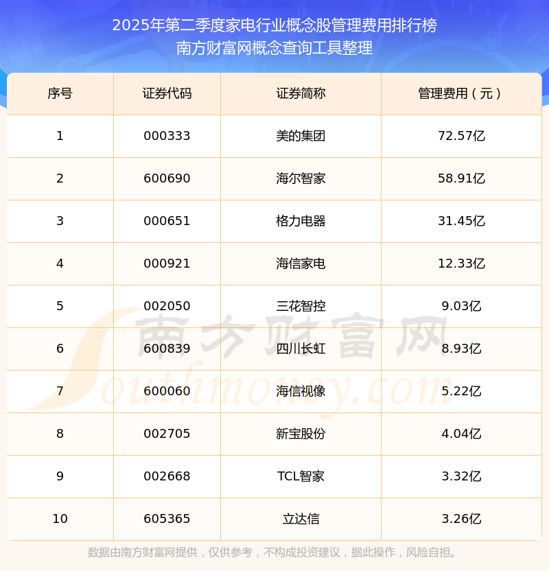 2025年第二季度,家電行業(yè)概念股管理費(fèi)用排行榜中,美的集團(tuán)(000333)的管理費(fèi)用總額高達(dá)72.57億,海爾智家(600690)和格力電器(000651)分別位居第二和第三,海信家電(000921)、三花智控(002050)、四川長(zhǎng)虹(600839)、海信視像(600060)、新寶股份(002705)、TCL智家(002668)、立達(dá)信(605365)分別進(jìn)入前十,其管理費(fèi)用總額分別排名第4-10名。